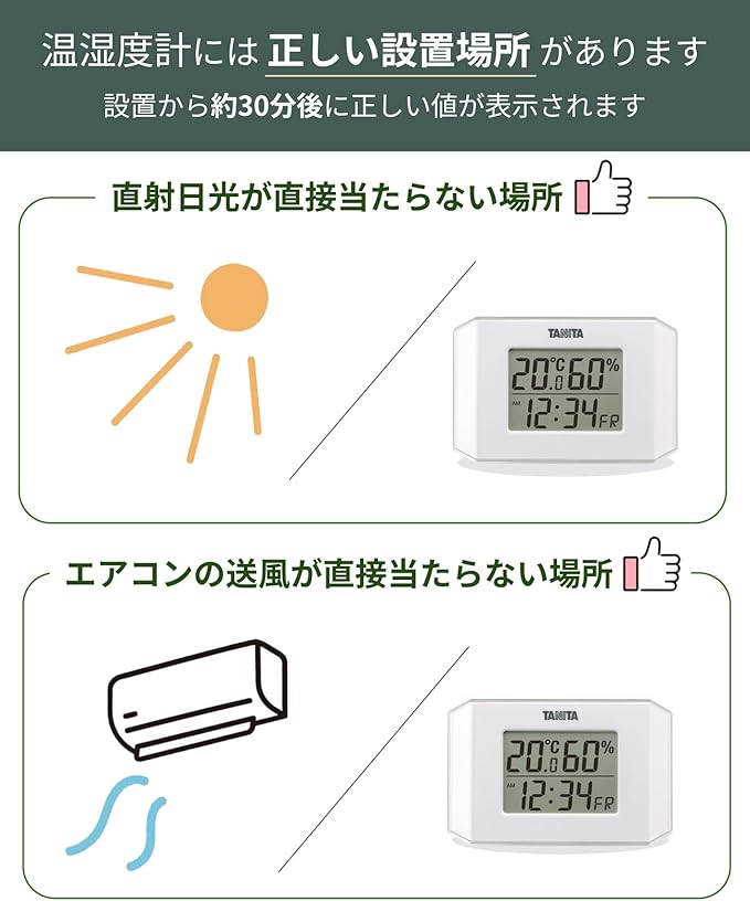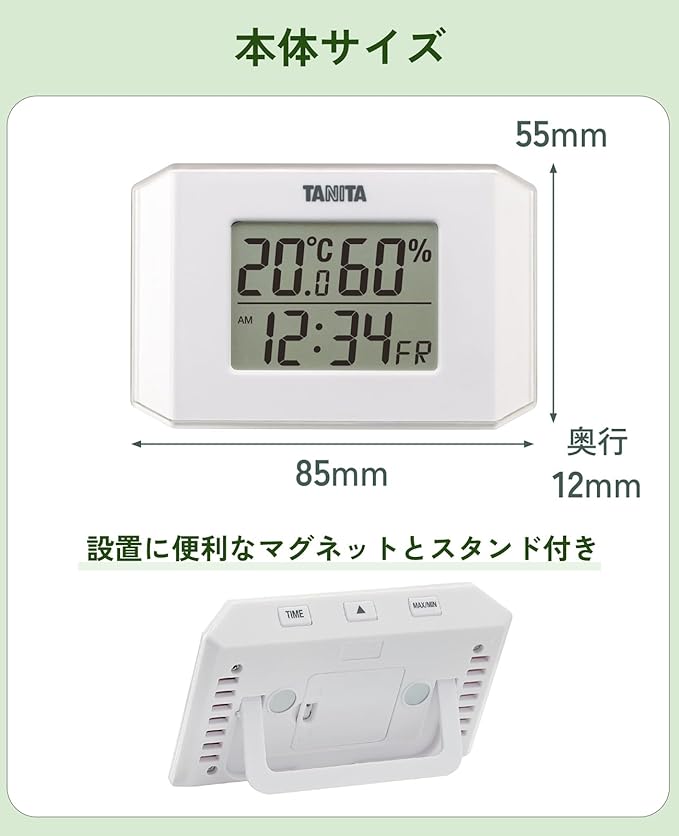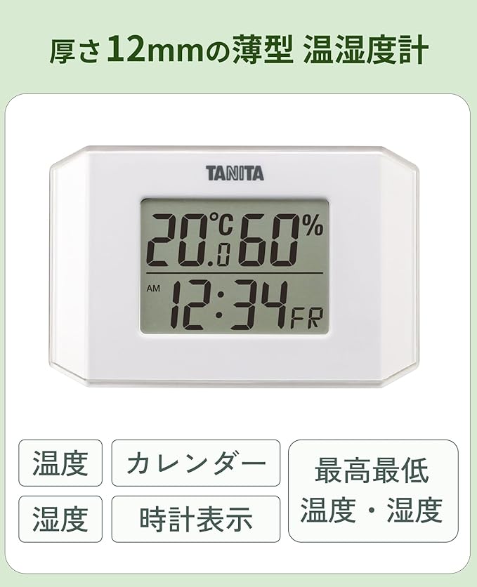 厚さ12㎜の薄型設計で、すっきりとしたシンプルなデザインの温湿度計。