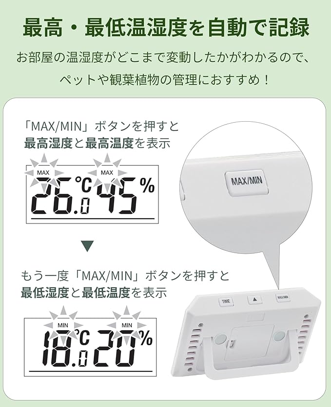 過去の最高・最低温湿度を表示する機能が付いているので、